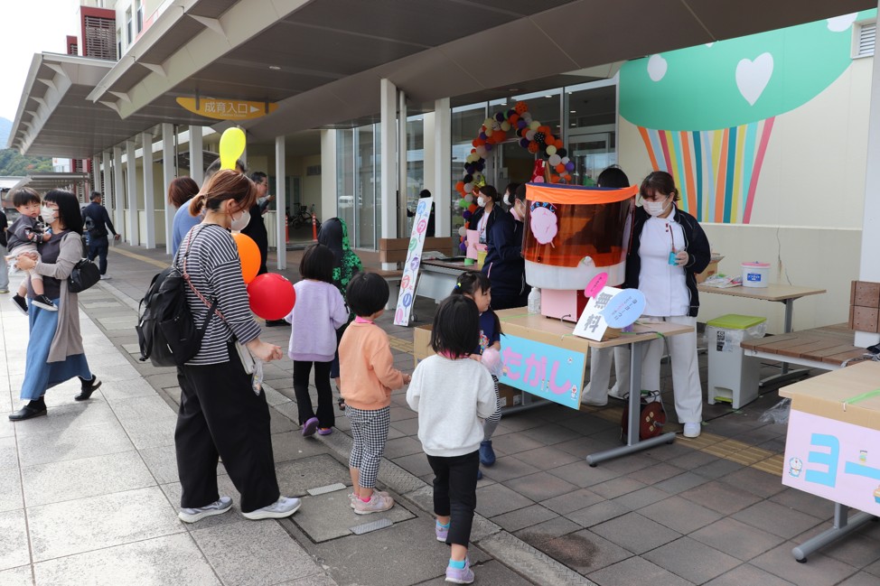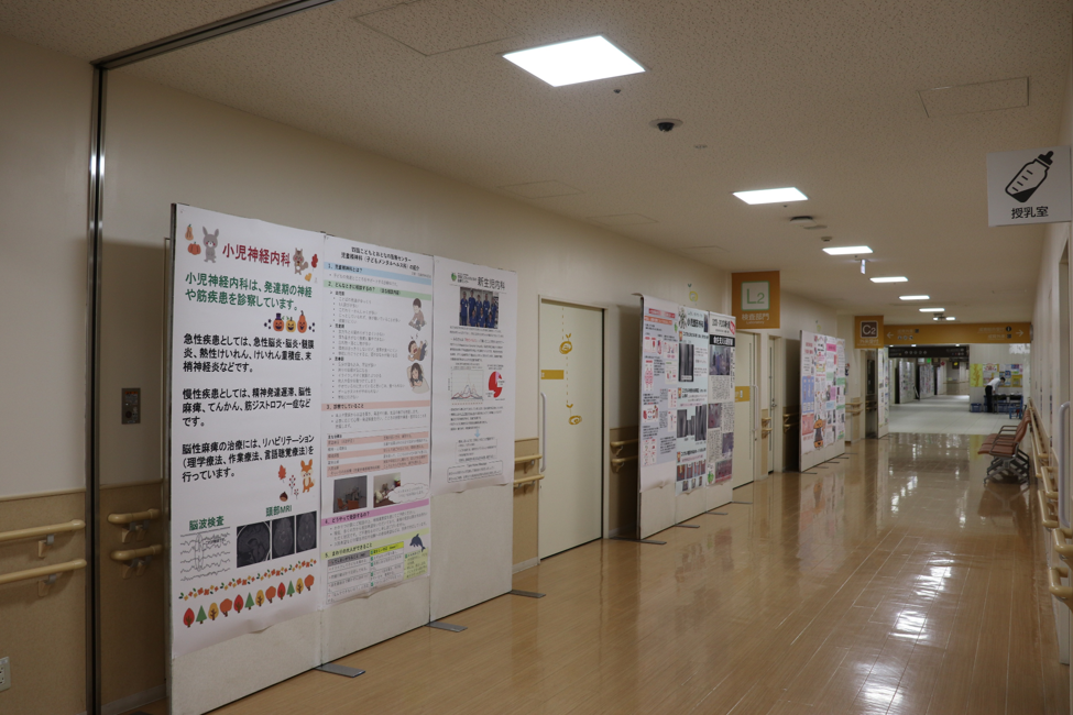 今年はキッチンカーが初出店し、軽食を楽しむ来場者の姿が見られました。屋外では、警察・自衛隊・消防による車両展示、ヨーヨー釣りや綿あめ、スタンプラリーなどがにぎわいを見せ、玄関では大きなバルーンアートが皆さまをお迎えしました。また、院内の壁には診療科や病棟をはじめ、日頃は目に触れる機会の少ない各部門の紹介ポスターを40枚以上掲示し、当院の活動を幅広く知っていただく機会となりました。