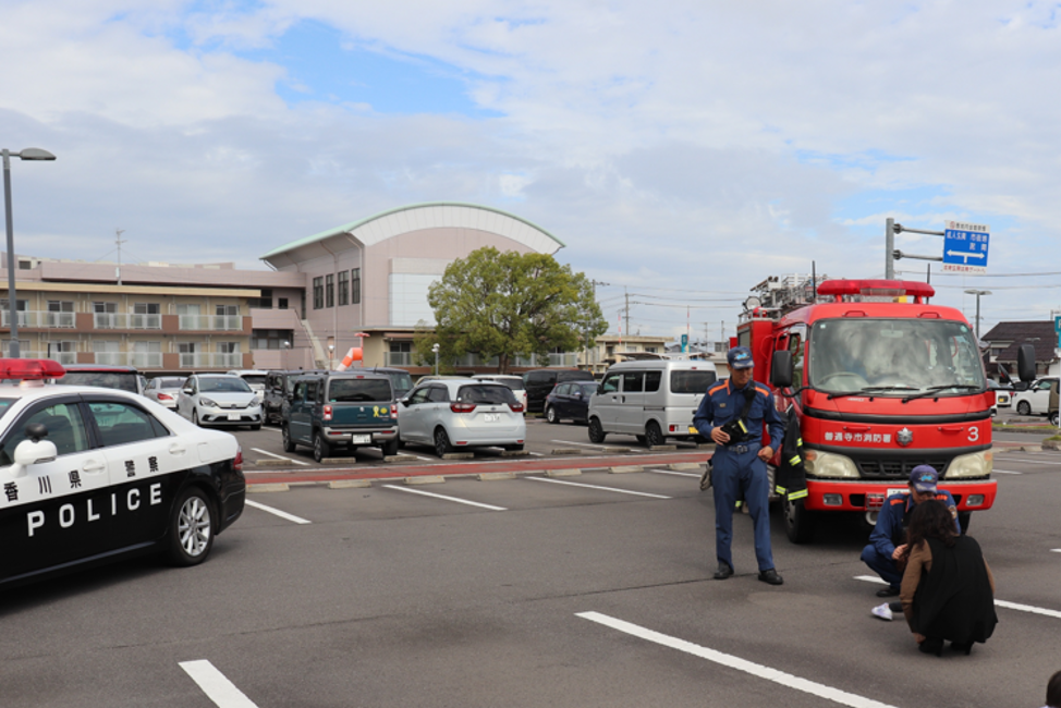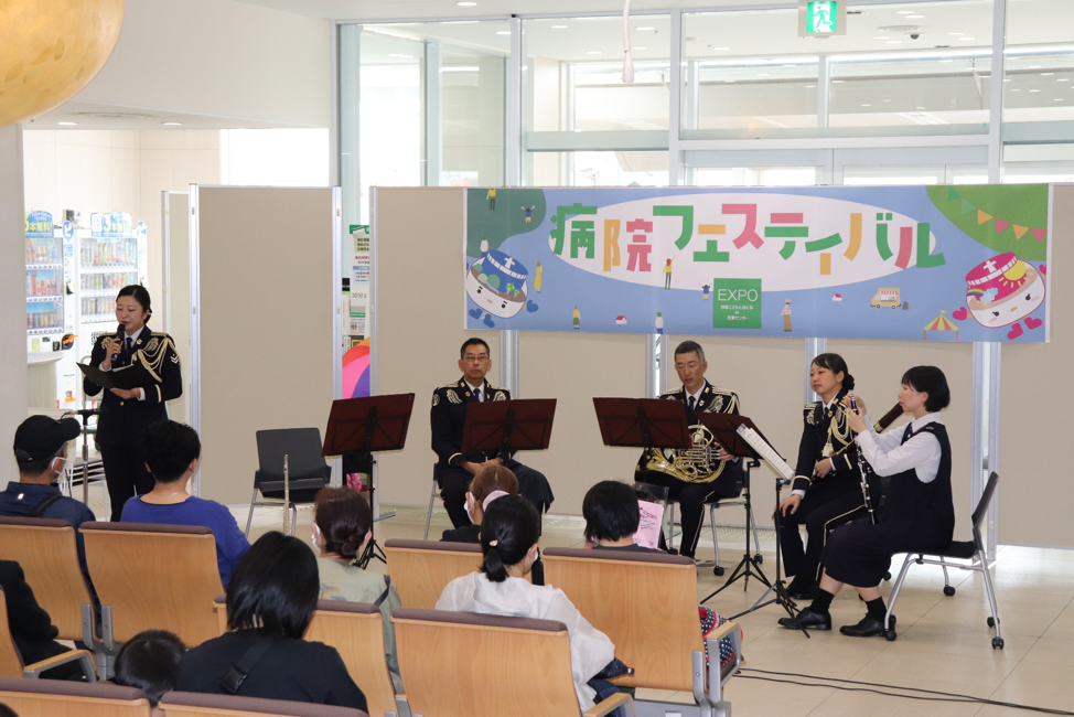 1階外来では、看護師体験、病理検査体験、放射線科による体験イベント、手浴、絵手紙づくりなど、多彩なブースが並びました。別会場では、手づくり帽子のワークショップも行われました。中央ステージでは、善通寺自衛隊音楽隊および善通寺第一高校吹奏楽部の皆さまによる演奏に続き、シャボン玉ショーが披露され、大いに盛り上がりました。
